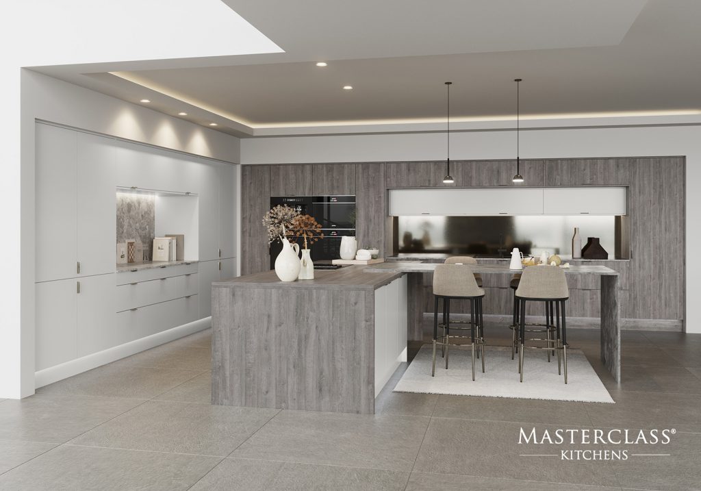 Stunning, functional spaces can easily be created within L shaped kitchens. Depending on the length of the room we are working within, we can create a sense of drama through gradually reducing heights of tall and wall units, or sharply contrasting colours between base units, and wall and tall units. As L-shaped kitchens do not have a third wall, creating a “working triangle” is not possible within this arrangement. However, organising a methodical workflow from food storage, to the sink, to the cooking and then serving area ensures that there is no impediment to our clients’ enjoyment of their new kitchens as a place within which to cook.