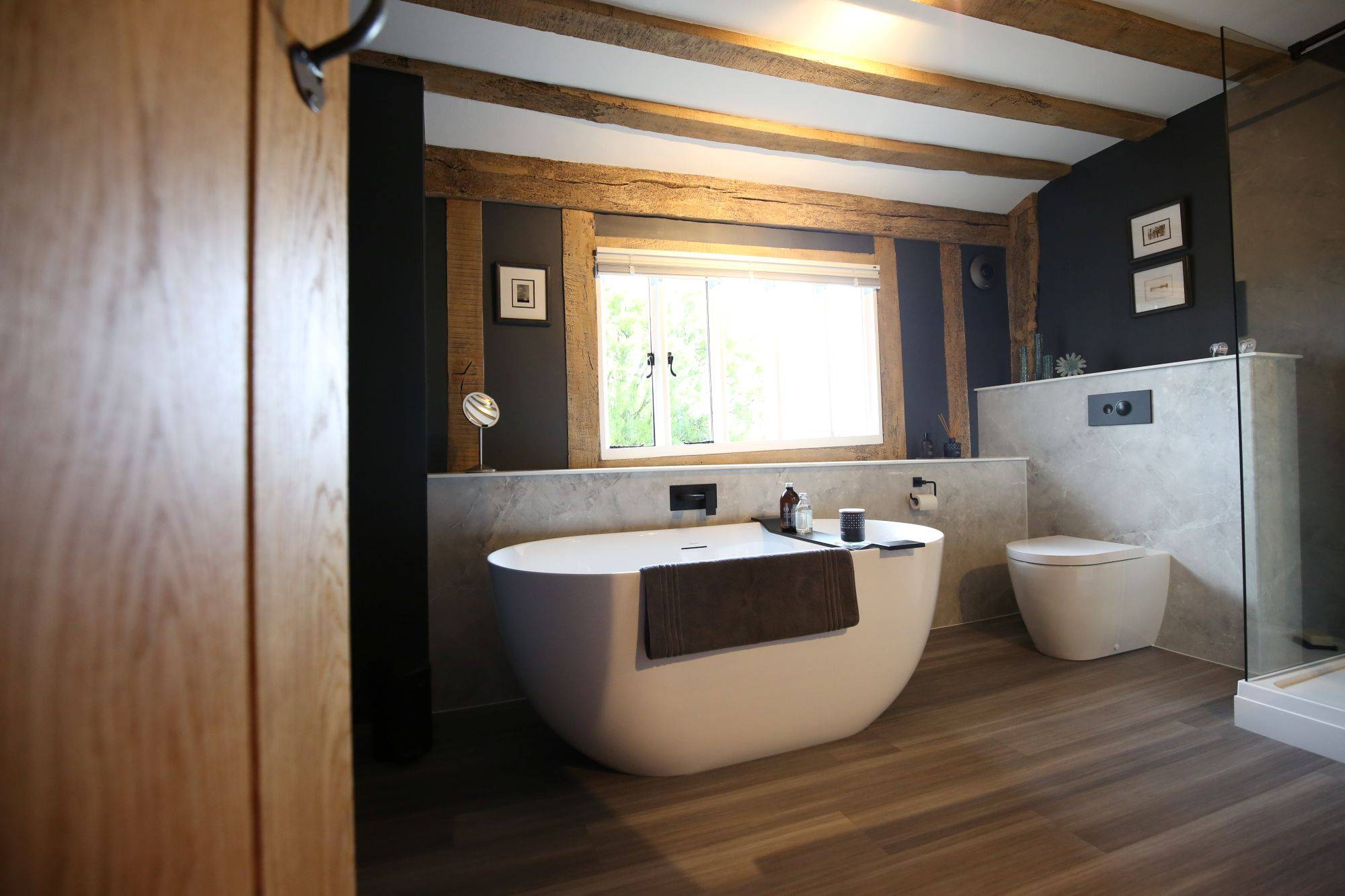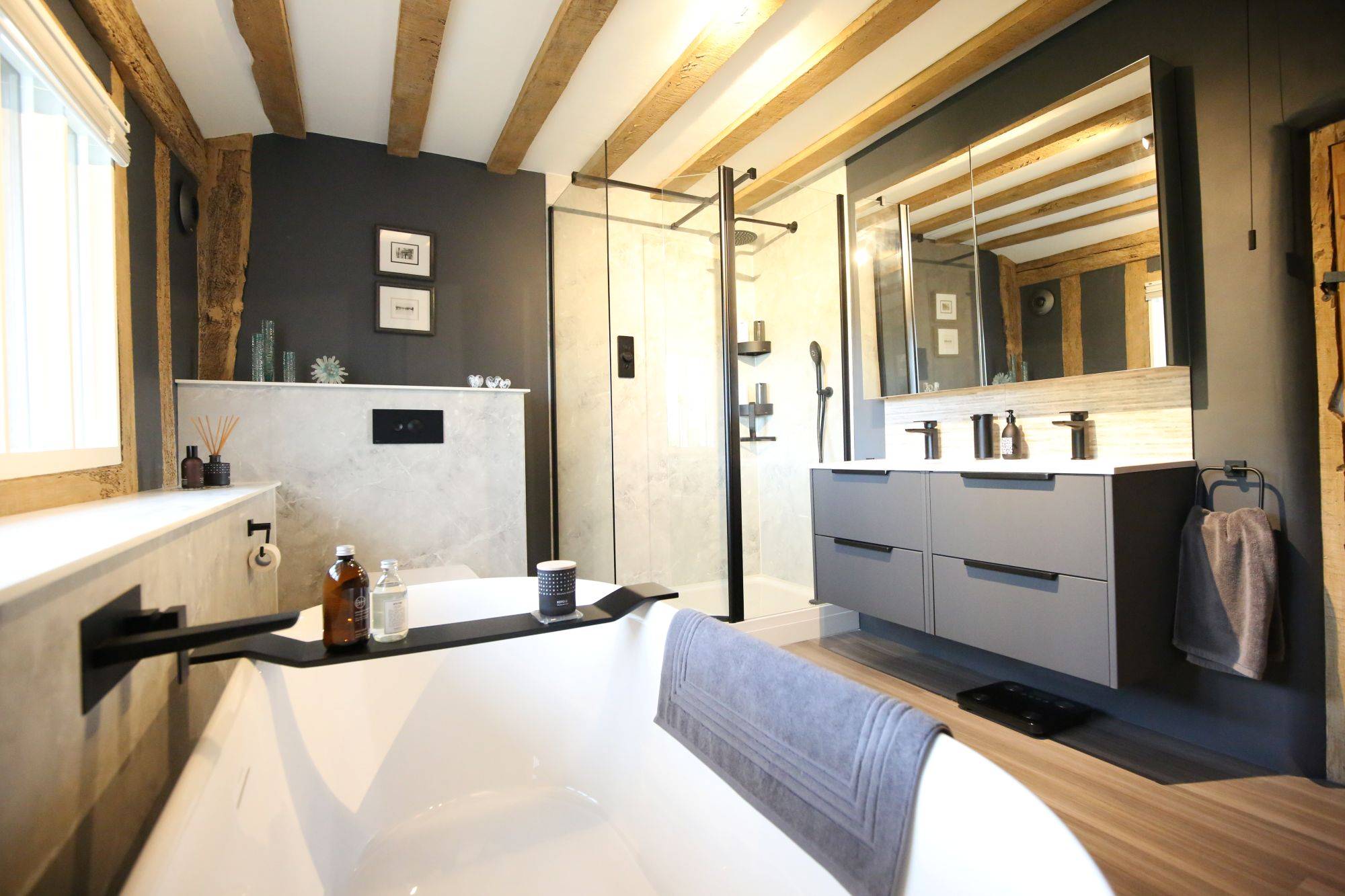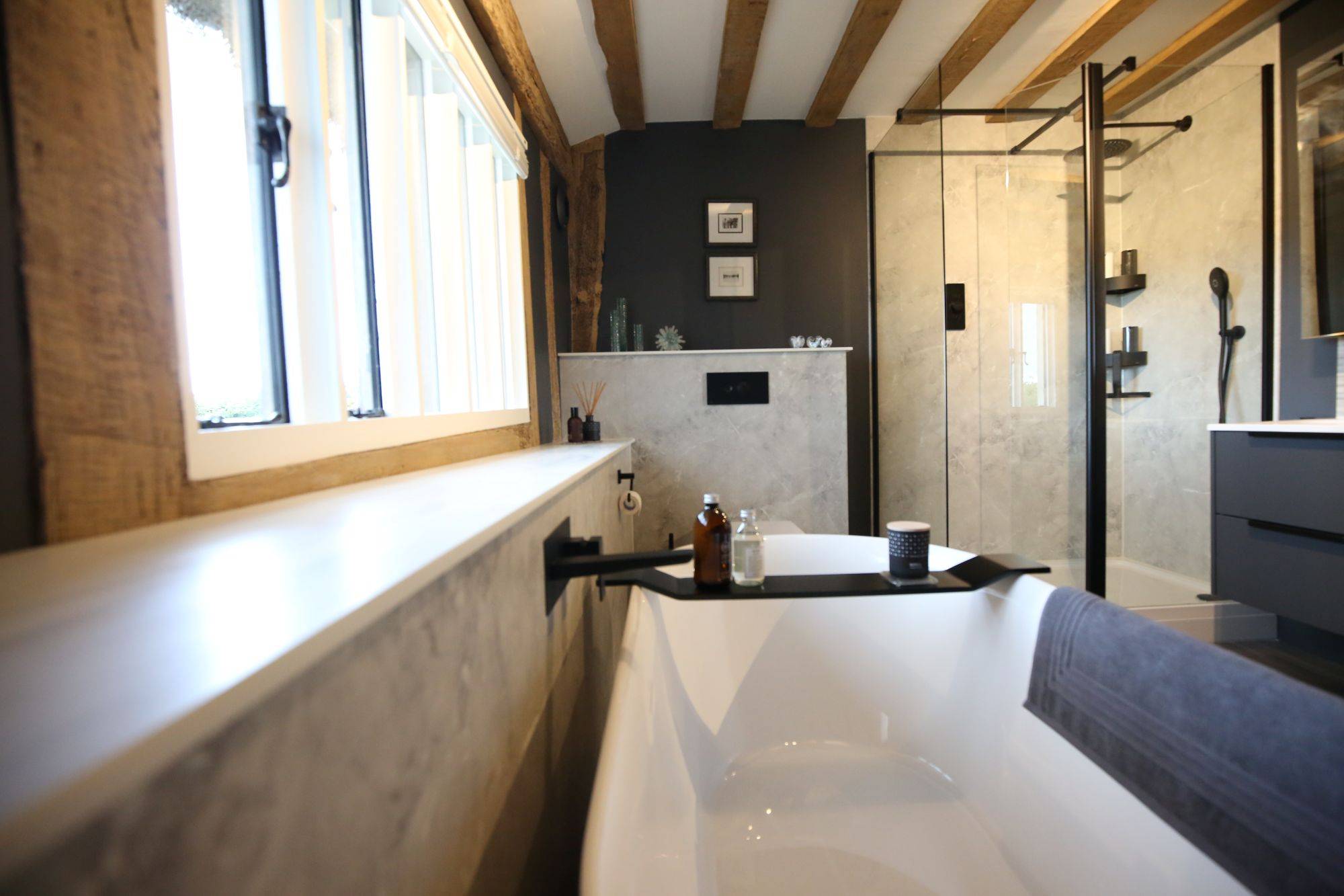 A modern freestanding bath was chosen as the striking centrepiece, paired with a wall-hung vanity unit by Calypso Bathrooms in Soft Graphite. As an alternative to traditional tiling, we installed Mermaid Elite shower panels, bringing a clean, contemporary finish. To complete the look, we added matt black fittings for a bold touch.