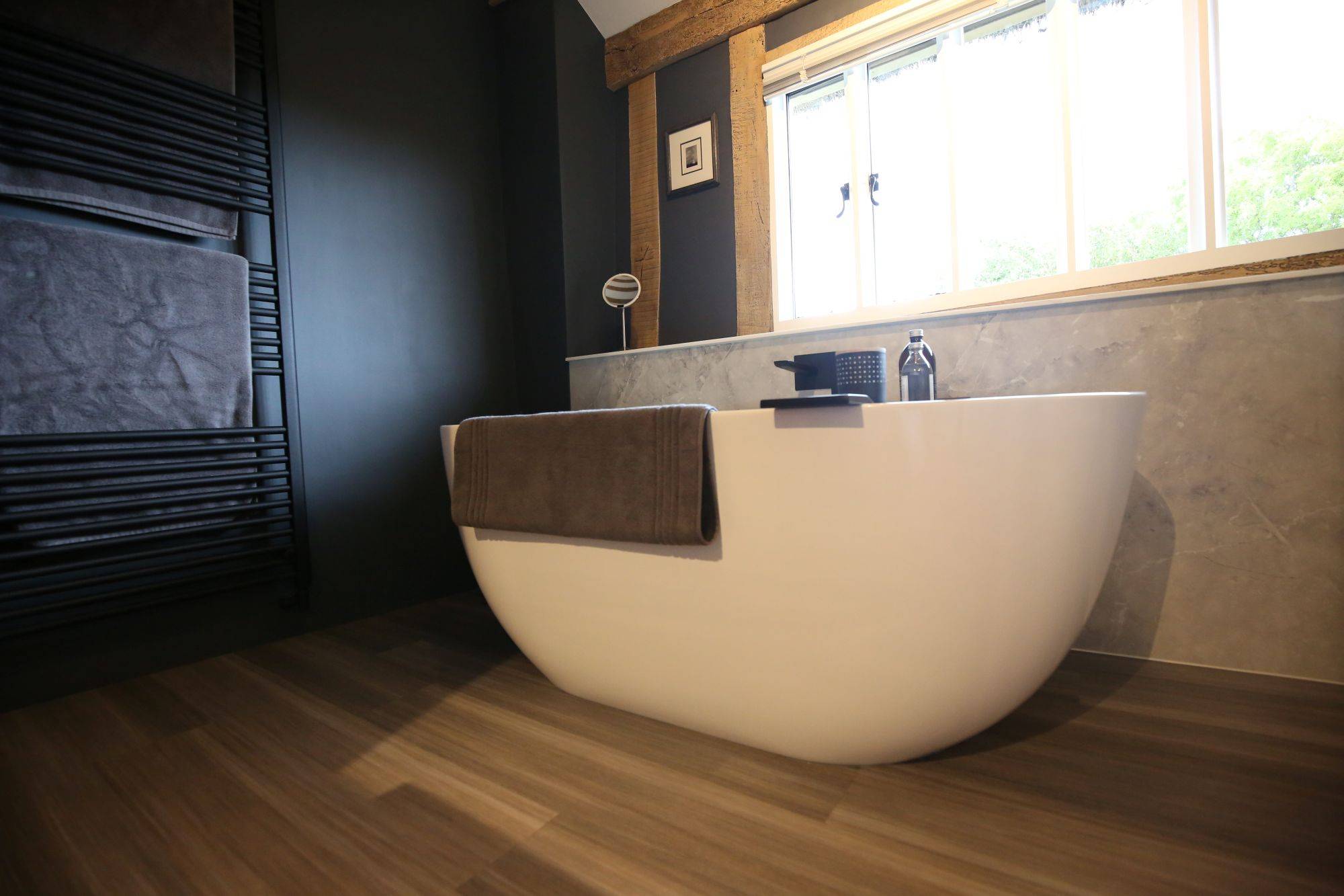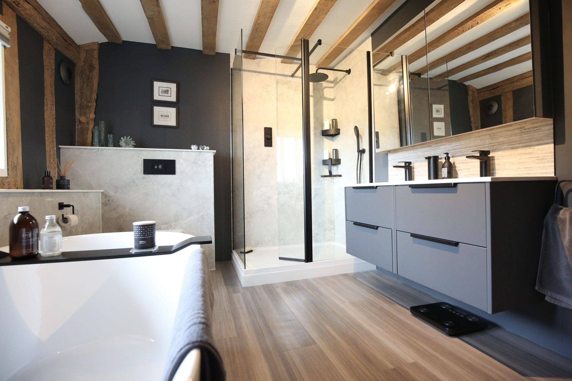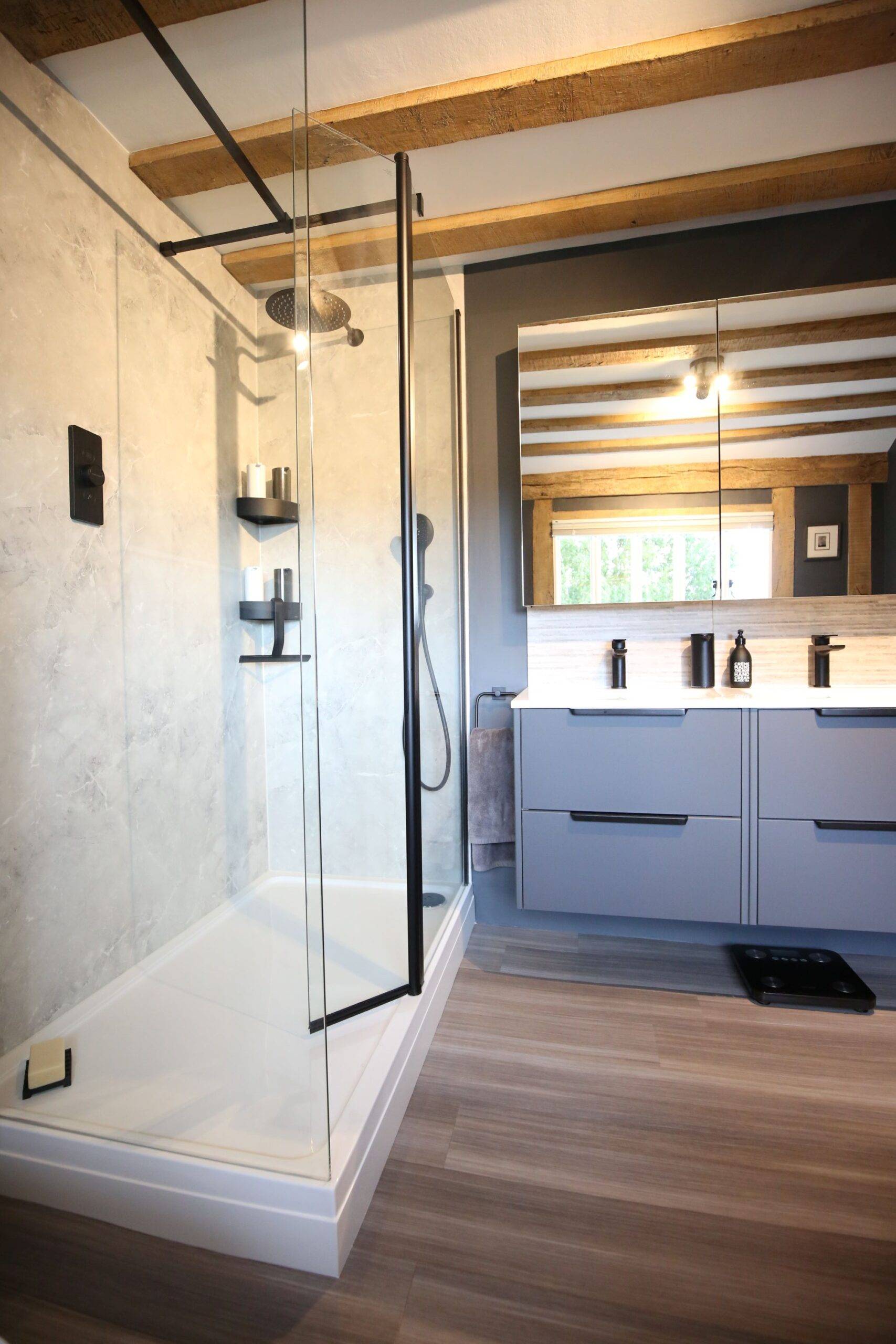 A modern freestanding bath was chosen as the striking centrepiece, paired with a wall-hung vanity unit by Calypso Bathrooms in Soft Graphite. As an alternative to traditional tiling, we installed Mermaid Elite shower panels, bringing a clean, contemporary finish. To complete the look, we added matt black fittings for a bold touch.